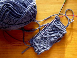 Despite the very complex-looking chart, I am actually finding these a straightfoward knit. I think that for any knitter with a little cable experience under their belt, the process is largely intuitive. By that I mean that so long as I am careful to switch the correct stitch over the top, deciding whether to knit or to purl doesn’t require peering at the pattern. Just as well, I’d go completely cross-eyed trying to spot the dotted symbols and remember which symbol means what – even though I carefully highlighted my left and right crossing stitches in pink and green highlighter last night.